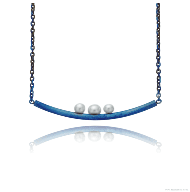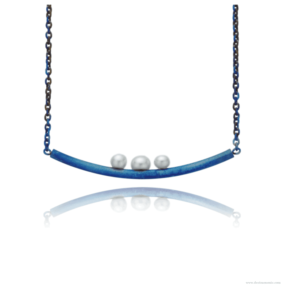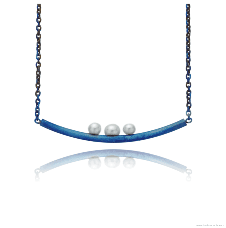 collar de barra curva de titanio azul hecho a mano con cadena de titanio y broche de langosta, y tres perlas cultivadas en agua dulce.