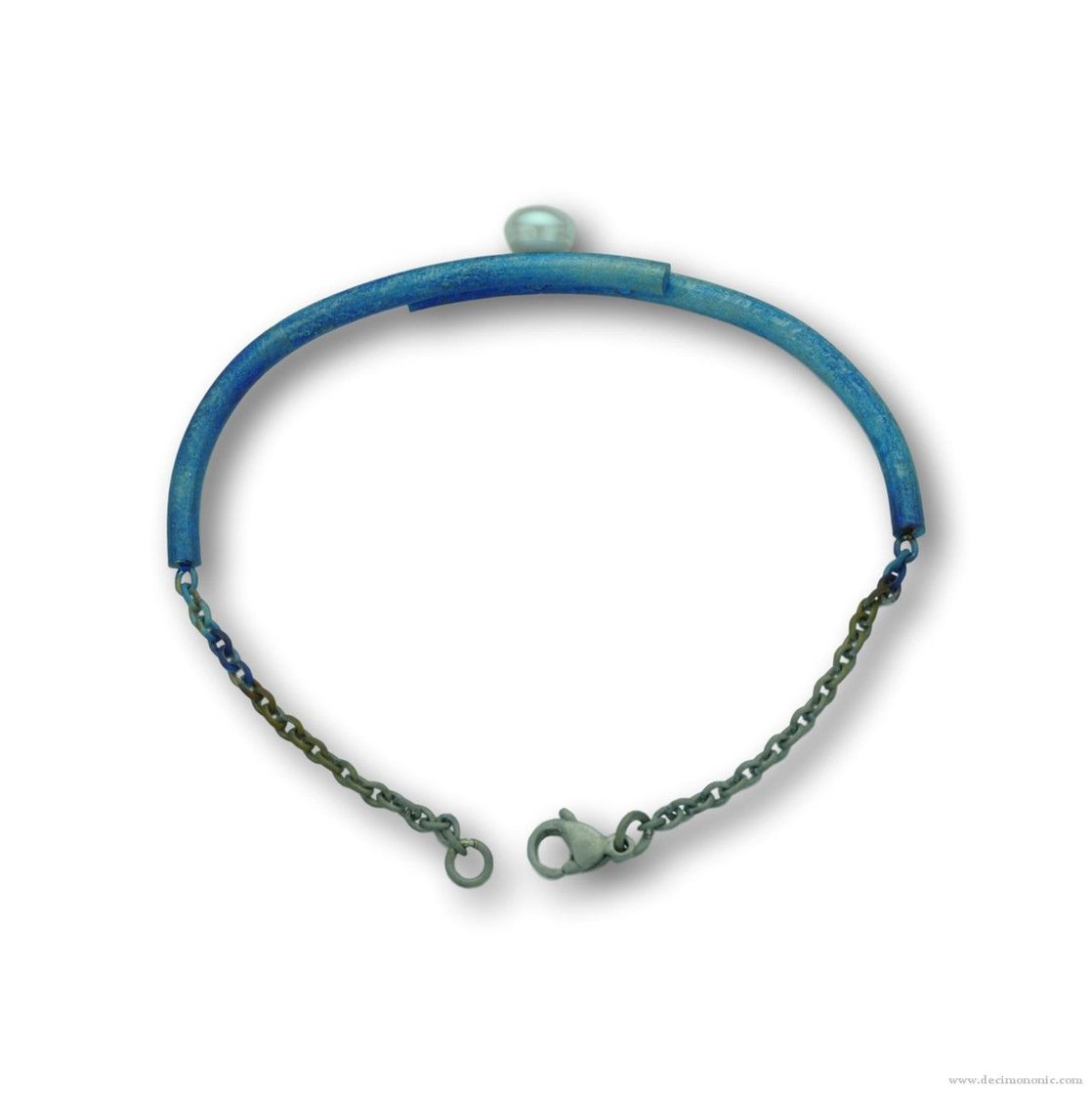 Doble manilla de titanio azul hecha a mano con cadena y broche de langosta de titanio, y una perla cultivada de agua dulce.