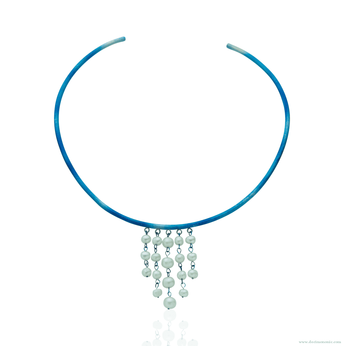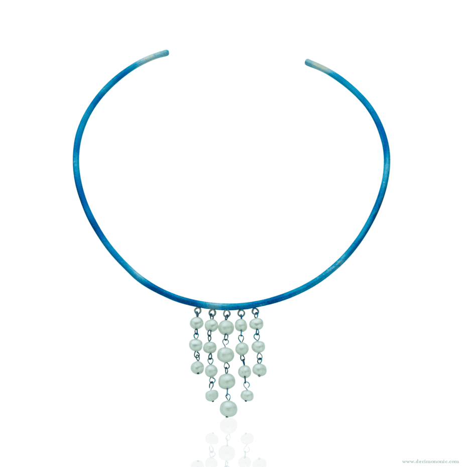 Gargantilla rígida de titanio de color azul hecha a mano con cinco tiras de perlas cultivadas de agua dulce.